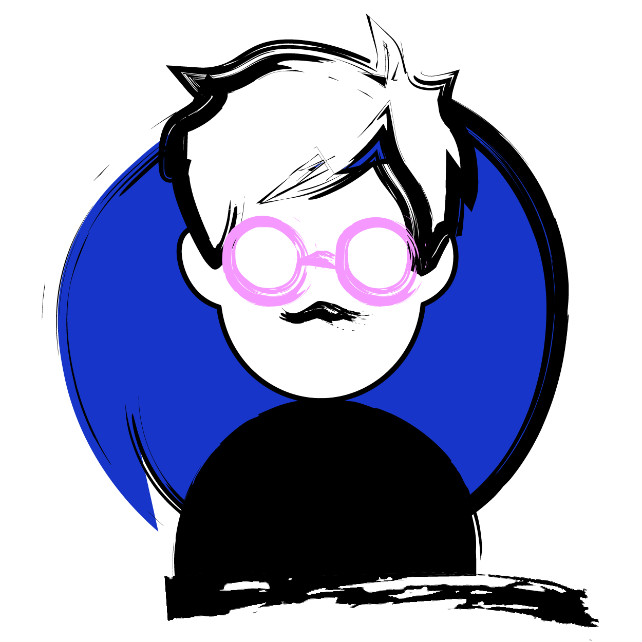 Digital illustration of a person with light-colored hair, glasses, and a mustache, wearing a black shirt, set against a dark background with a blue circular element.